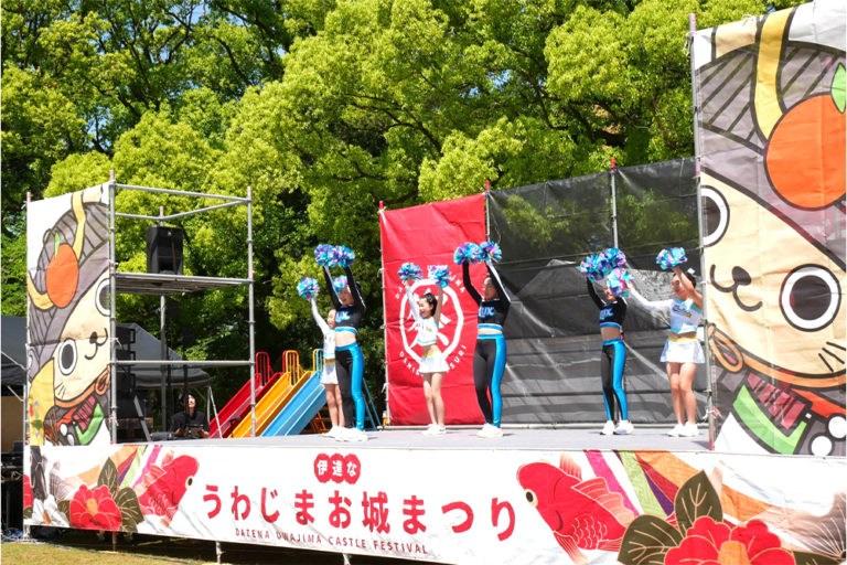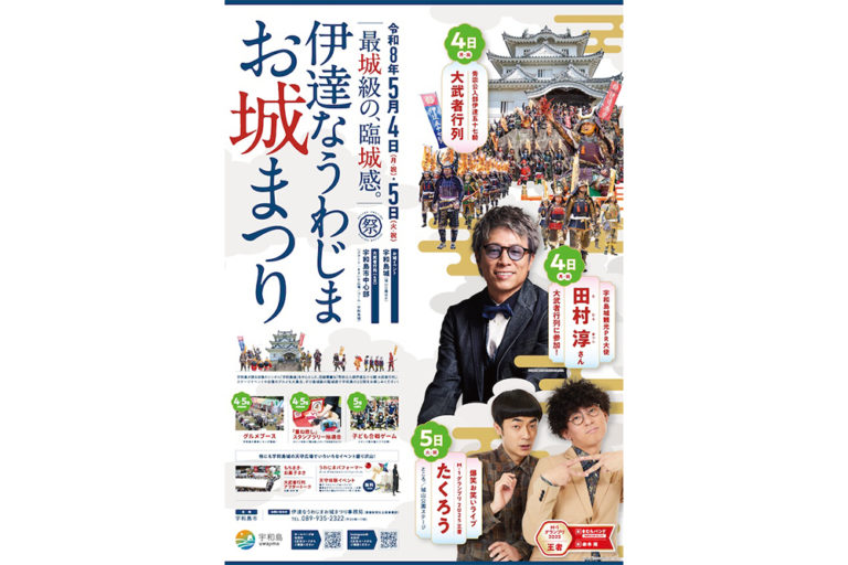 「伊達な宇和島お城まつり」では、伊達秀宗公の宇和島入部を再現した「秀宗公入部伊達五十七騎大武者行列」をはじめ、宇和島のシンボル「宇和島城」を中心に、城山公園内でのステージイベントや天守での体験イベントなどを開催。