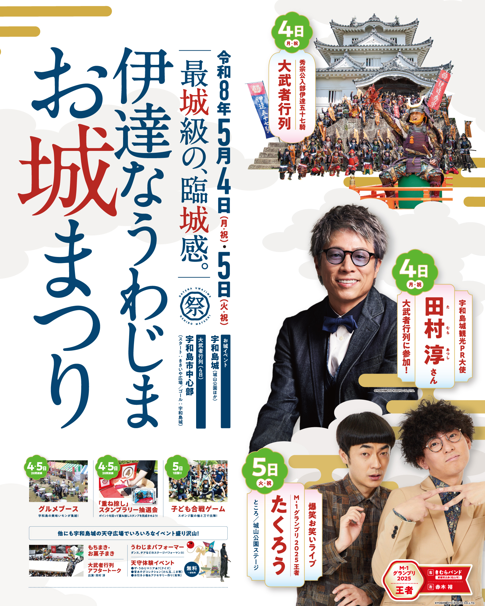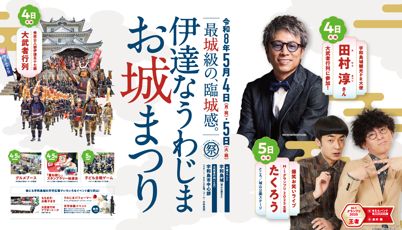 「伊達な宇和島お城まつり」では、伊達秀宗公の宇和島入部を再現した「秀宗公入部伊達五十七騎大武者行列」をはじめ、宇和島のシンボル「宇和島城」を中心に、城山公園内でのステージイベントや天守での体験イベントなどを開催。